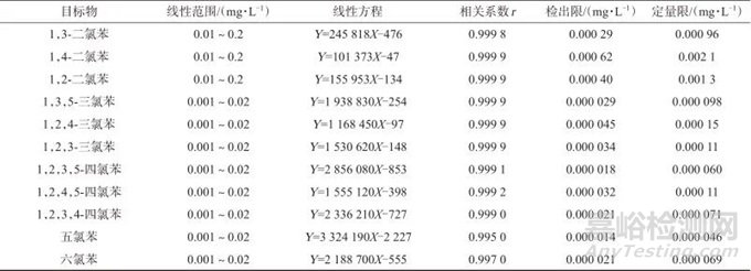 Tab. 1 Linear range,linear equation,correlation coefficient,detection limit and quantitation limit of 11 chlorobenzene compounds