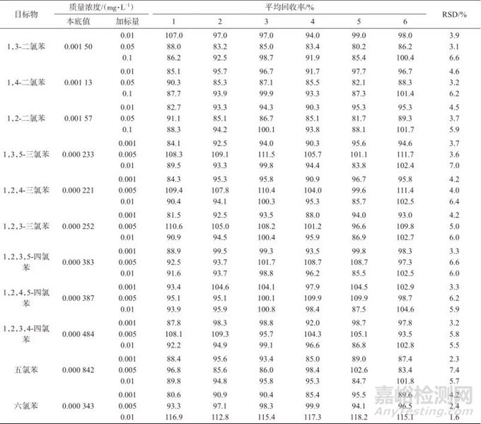 在生活飲用水樣品中,分別按照10、50、100 µL 三種加標(biāo)水平,加入11種氯苯類化合物混合標(biāo)準(zhǔn)使用液,每個濃度分別測定6次,計算樣品加標(biāo)回收率和測定結(jié)果的相對標(biāo)準(zhǔn)偏差(RSD),加標(biāo)回收與精密度試驗結(jié)果見表2。