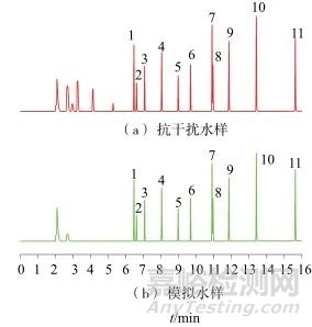 圖6 11種氯苯類化合物模擬及抗干擾水樣色譜圖