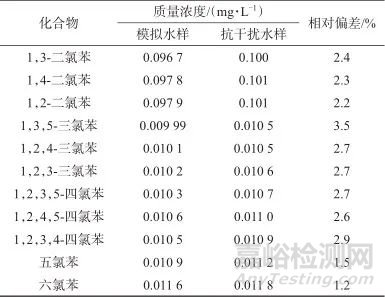 表3 11種氯苯類化合物模擬及抗干擾水樣結(jié)果