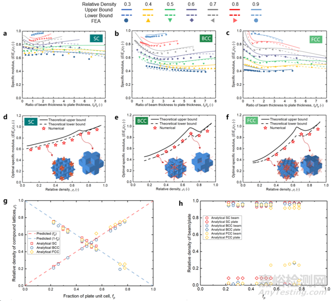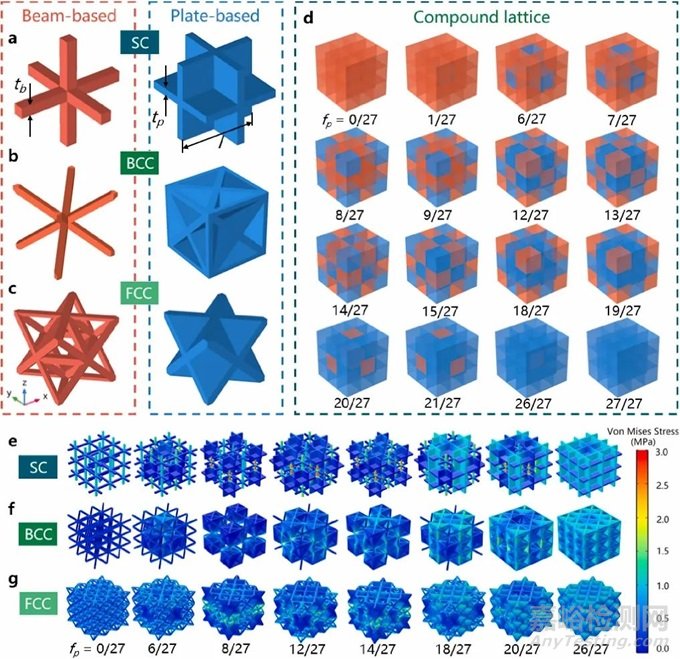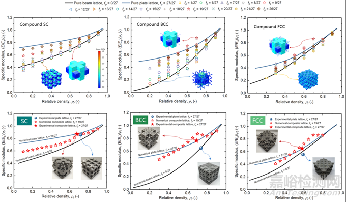 該研究系統(tǒng)地研究了復(fù)合晶格的力學(xué)特性。復(fù)合晶格由占據(jù)不同位置的2種拓?fù)錁?gòu)型組成,其拓?fù)錁?gòu)型包括簡(jiǎn)單立方(SC)、體心立方(BCC)和面心立方(FCC)的板和梁結(jié)構(gòu)胞元。研究團(tuán)隊(duì)利用理論模型和有限元模擬詳細(xì)研究了復(fù)合晶格的剛度和各向同性,并對(duì)特定拓?fù)錁?gòu)型的增材制造樣品進(jìn)行了試驗(yàn)驗(yàn)證。