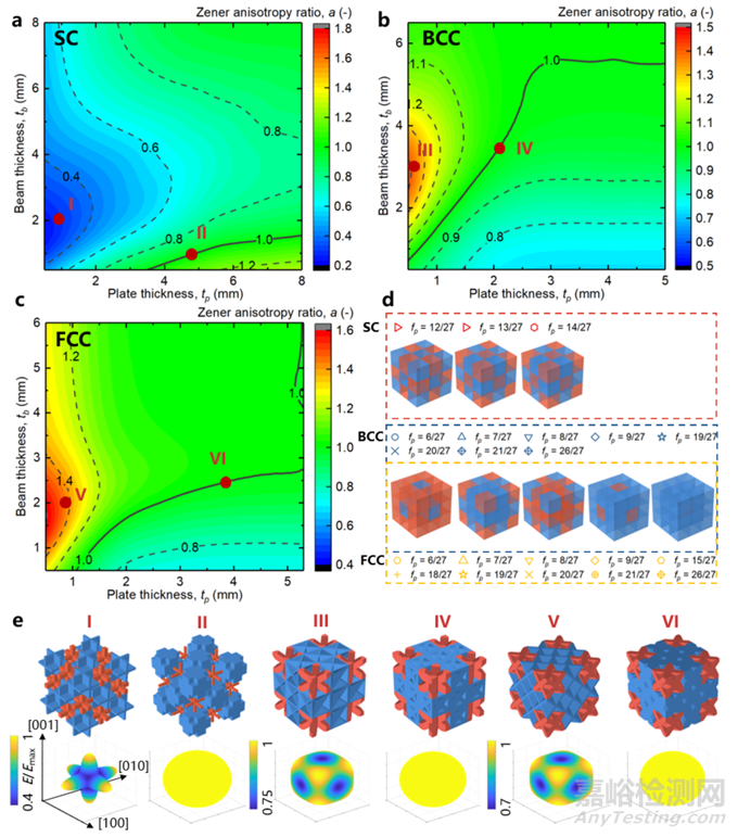 研究團(tuán)隊(duì)研究了梁厚度、板厚度和板胞元占比對(duì)復(fù)合晶格的剛度各向同性影響。通過計(jì)算有限元模擬中各復(fù)合晶格的齊納比,得到了不同參數(shù)下復(fù)合晶格的可編程各向同性。首次報(bào)道了由不同梁和板胞元特定排列產(chǎn)生的各向同性幾何結(jié)構(gòu)。