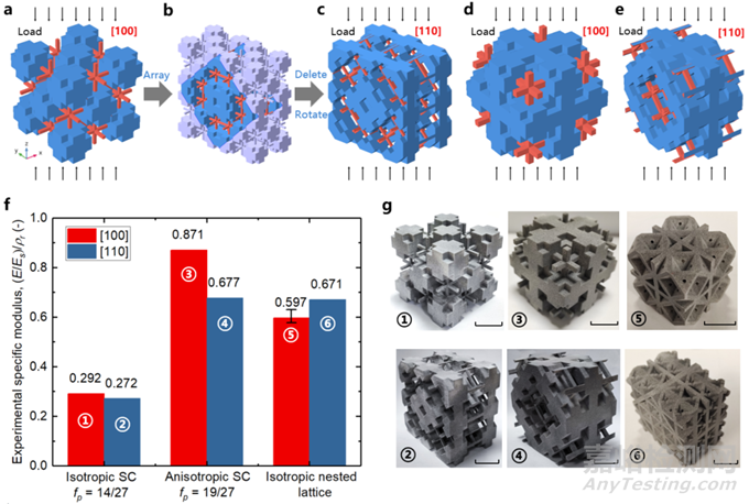 為驗(yàn)證復(fù)合晶格各向同性的有限元模擬結(jié)果,研究團(tuán)隊(duì)3D打印了梁板復(fù)合晶格樣件,并對(duì)其沿<100>和<110>方向進(jìn)行單軸壓縮。各向同性復(fù)合晶格在不同方向上表現(xiàn)出相似的比模量,差異小于7%,而各向異性復(fù)合晶格在<100>方向上的比模量比<110>方向上高出28.7%。