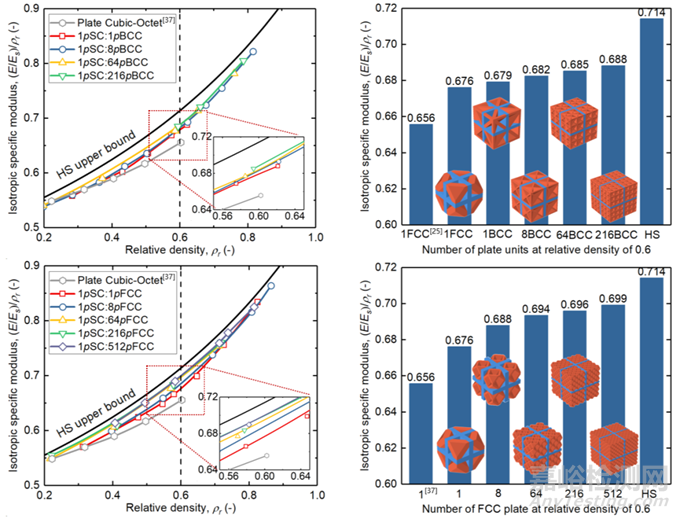 此外,研究團(tuán)隊(duì)還進(jìn)行了層級(jí)復(fù)合晶格設(shè)計(jì)。研究發(fā)現(xiàn)增加復(fù)合pSC-pBCC和pSC-pFCC晶格中BCC或FCC板胞元的數(shù)量可以進(jìn)一步提高楊氏模量。將BCC板胞元的數(shù)量從8個(gè)增加到216個(gè),模量提高了0.88%,達(dá)到H-S理論上限的96.4%。將FCC板胞元從8個(gè)增加到512個(gè),模量提高了1.6%,達(dá)到理論上限的97.9%。