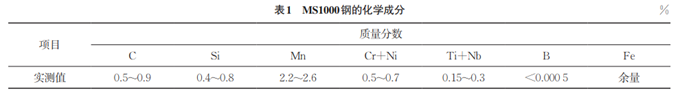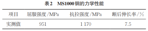 試驗對象為1.8mm厚熱軋1000MPa級MS1000馬氏體鋼,其化學(xué)成分及力學(xué)性能分別如表1,2 所示。采用熱膨脹儀測量MS1000 鋼的組織轉(zhuǎn)變曲線,升溫和降溫速率均為3℃/min,采用切線法測量得到奧氏體起始轉(zhuǎn)變溫度(Ac1) 和終止轉(zhuǎn)變溫度(Ac3)分別為736.8,858.9 ℃。