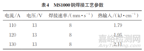 焊接試驗鋼板的尺寸(長度×寬度×厚度)為200mm×400 mm×1.8 mm,焊接方向與軋向垂直。選用直流氣體保護焊機配備焊接機器人對MS1000鋼進行焊接,焊接材料為1.2mm(直徑)的70kg級焊絲,其主要化學(xué)成分如表3所示。接頭采取對接形式,保護氣為混合氣體(體積分數(shù)為80%的CO2+體積分數(shù)為20%的氬氣),焊接間隙為0.5mm。焊接過程及焊后冷卻至室溫前,試驗鋼板均夾持在焊接操作臺上,防止其發(fā)生熱變形。通過改變焊接電流可獲得不同熱輸入的焊接接頭,具體工藝參數(shù)如表4所示。當焊接熱輸入達到1.79kJ/cm 時,可獲得全熔透焊縫,焊接工藝窗口為1.79~2.11kJ/cm。