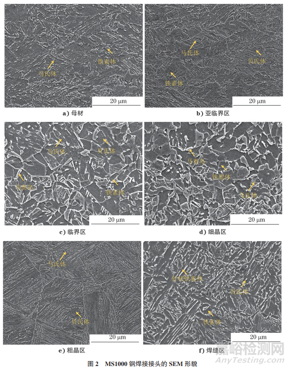 MS1000鋼焊接接頭的SEM形貌如圖2所示。由圖2可知:與傳統(tǒng)馬氏體鋼不同,MS1000鋼組織中除馬氏體外,含有質(zhì)量分數(shù)約為15.6%的鐵素體,分布于馬氏體之間,馬氏體的平均尺寸約為10μm,鐵素體的平均尺寸約為3μm;不同焊接熱輸入的焊縫及熱影響區(qū)組織具有一致性,亞臨界區(qū)組織為馬氏體+鐵素體+ 貝氏體;臨界區(qū)組織為馬氏體+鐵素體+貝氏體+馬奧島;細晶區(qū)組織為馬氏體+鐵素體+馬奧島;粗晶區(qū)組織主要為馬氏體,伴隨極少量貝氏體;焊縫區(qū)組織為針狀鐵素體+貝氏體+鐵素體,晶粒尺寸細小。