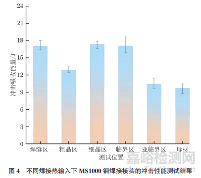 不同焊接熱輸入下MS1000鋼焊接接頭的沖擊性能測試結(jié)果如圖4所示。由圖4可知:MS1000鋼的平均沖擊吸收能量為9.73J,與其相比,焊縫區(qū)及各個熱影響區(qū)平均沖擊吸收能量均有不同程度的提高;焊縫區(qū)、臨界區(qū)和亞臨界區(qū)的平均沖擊吸收能量最高,達17J以上;粗晶區(qū)平均沖擊吸收能量次之,為12.84J;亞臨界區(qū)平均沖擊吸收能量為10.45J。