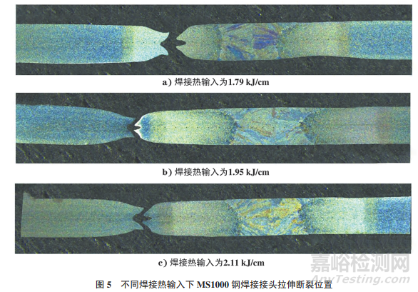 不同焊接熱輸入下MS1000鋼焊接接頭拉伸斷裂位置如圖5所示。由圖5可知:當焊接熱輸入為1.79kJ/cm時,斷裂位置為細晶區(qū),與焊接接頭細晶區(qū)軟化現(xiàn)象最嚴重的情況相吻合;當焊接熱輸入為1.95,2.11kJ/cm時,斷裂位置為亞臨界區(qū)。