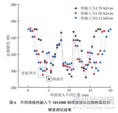 不同焊接熱輸入下MS1000鋼焊接接頭拉伸斷裂后的硬度測試結(jié)果如圖6所示。由圖6可知:當焊接熱輸入為1.79kJ/cm時,拉伸斷裂后硬度最低點出現(xiàn)在細晶區(qū),最低硬度為290HV;當焊接熱輸入為1.95,2.11kJ/cm時,斷裂后硬度最低點出現(xiàn)在亞臨界區(qū),其硬度分別為295HV和302HV,此時細晶區(qū)硬度分別為321HV和323HV。說明當焊接熱輸入為1.95,2.11kJ/cm 時,拉伸過程中細晶區(qū)加工硬化程度加劇。