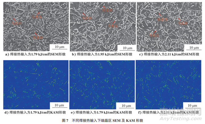 不同焊接熱輸入下細晶區(qū)的SEM及KAM(局部取向差)形貌如圖7所示。由圖7可知:當焊接熱輸入為1.79kJ/cm時,細晶區(qū)馬氏體、鐵素體及馬奧島的含量分別為67.6%,28.5%,3.9%,馬氏體及鐵素體的平均晶粒尺寸分別為3.6,2.1μm;當熱輸入為1.95kJ/cm 時,細晶區(qū)馬氏體、鐵素體及馬奧島的含量分別為70.3%,26.3%,3.4%,馬氏體及鐵素體的平均晶粒尺寸分別為4.1,2.5μm;當熱輸入增加至2.11kJ/cm時,細晶區(qū)馬氏體、鐵素體及馬奧島含量分別為73.4%,24.0%,2.6%,馬氏體及鐵素體的平均晶粒尺寸分別為5.0,2.8μm。隨焊接熱輸入的增加,細晶區(qū)馬氏體含量增加,鐵素體及馬奧島含量降低,平均晶粒尺寸增加。細晶區(qū)峰值溫度大于Ac3,焊接時該區(qū)域組織完全奧氏體化,隨著熱輸入的增加,原奧氏體晶粒尺寸增大,導(dǎo)致轉(zhuǎn)變后的組織晶粒尺寸增大,且冷卻過程中傾向于向低溫組織轉(zhuǎn)變,即馬氏體含量增加。馬氏體具有較高的硬度及位錯密度。