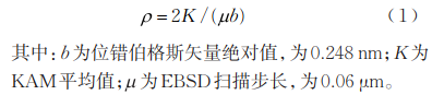 在對熱輸入較高的焊接試樣進行拉伸時,細晶區(qū)加工硬化程度增加,使得拉伸斷裂位置由細晶區(qū)變?yōu)閬喤R界區(qū)。材料位錯密度(ρ)的計算方法如式(1)所示。