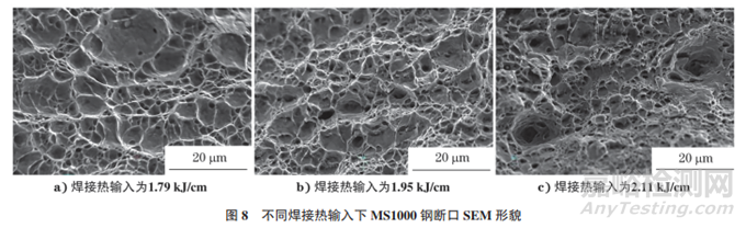 不同焊接熱輸入下MS1000鋼斷口的SEM形貌如圖8 所示。由圖8可知:試樣斷口均布滿韌窩,呈典型的韌性斷裂特征;當熱輸入為1.79kJ/cm時,韌窩平均尺寸為3.90μm;當熱輸入為1.95kJ/cm 時,韌窩平均尺寸為3.51 μm;當熱輸入為2.11kJ/cm 時,韌窩平均尺寸為2.92μm。隨著焊接熱輸入的增加,韌窩尺寸逐漸減小,即塑性下降。