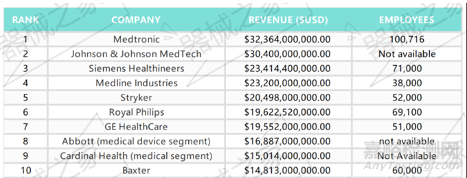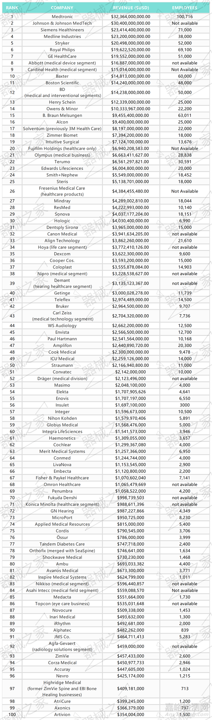 此次排行榜包括年收入、研發(fā)支出、員工人數(shù)、首席執(zhí)行官和關(guān)鍵領(lǐng)導(dǎo)、總部所在地和公司概況等內(nèi)容,除了專注于醫(yī)療器械生產(chǎn)研發(fā)的企業(yè),進(jìn)入榜單的企業(yè)還有雅培、強(qiáng)生這樣的制藥公司的醫(yī)療設(shè)備部門。