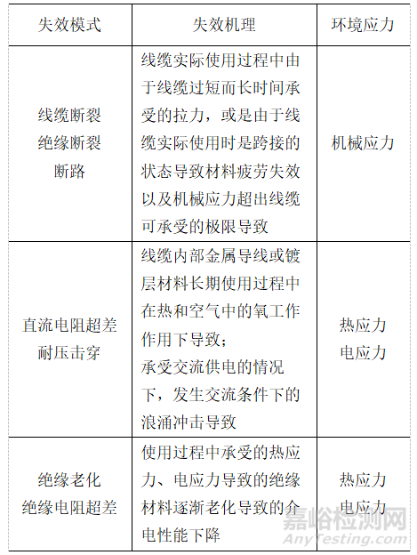 因此承受的機械應力可忽略不計。同時線纜是通過固定線槽在車內(nèi)部使用,主要承受的溫濕度的影響,而線纜外皮是屬于橡膠材料,依據(jù)相關標準主要是絕緣老化導致的失效。電線失效模式及失效機理見表1。