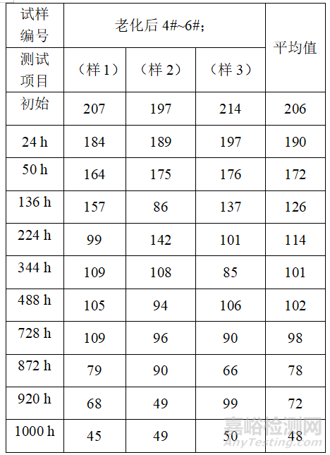 (2)程序B:將第二組樣品9#;75#~104#;105#~134#試樣放入130℃的試驗箱進行1000h考核,按表3規(guī)定的時間點取樣,9#進行絕緣電阻測試,測試后立即放入老化試驗箱繼續(xù)試驗,75#~104#;105#~134#中每次各取3小段進行拉斷力,拉斷伸長率和擊穿電壓測試。