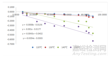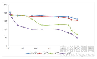 根據(jù)初始分解溫度確定預試驗的溫度為150℃,對3件樣品進行24小時的預實驗,預實驗前后測試拉斷力和拉斷伸長率。24 h后其拉斷力和拉斷伸長率均大于初始狀態(tài)的80%。則可以以150℃作為壽命實驗的最高溫度,以10℃為溫度間隔確定壽命試驗的溫度點,測試結(jié)果見表2.。