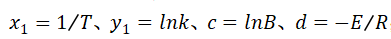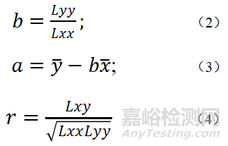 計算每個老化試驗溫度的性能變化速度常數(shù)k以及A值,令x=τ,y=lnP,a=lnA,b=-k。則可以用表示。利用最小二乘法求得系數(shù)a、b及相關系數(shù)r,見公式(2)~公式(4);