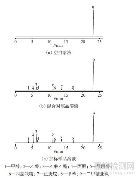 在1.2色譜條件下,分別取空白溶劑、混合對照品溶液、加標(biāo)樣品溶液依次進(jìn)樣分析,色譜圖如圖1所示。從圖1中可以看出,8種溶劑色譜峰之間的分離度均大于2.0,空白溶劑對測定無干擾。該方法的專屬性符合要求。