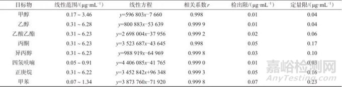 表1 8種溶劑質(zhì)量濃度的線性范圍、線性方程、相關(guān)系數(shù)、檢出限和定量限