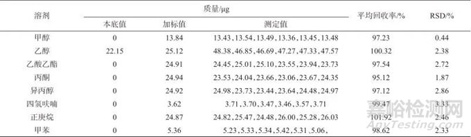 取小兒止咳糖漿樣品0.1 mL,置于20 mL容量瓶中,精密加入混合對照品儲備液0.4 mL,再加入二甲基亞砜稀釋至標(biāo)線,搖勻,精密量取2.0 mL,置于頂空瓶中,加蓋密封,搖勻,在1.2色譜條件下進(jìn)樣測定,平行制備6份,記錄色譜峰面積并計(jì)算各種溶劑的平均回收率及相對標(biāo)準(zhǔn)偏差。樣品加標(biāo)回收與精密度試驗(yàn)結(jié)果見表2。由表2可知,8種溶劑的平均回收率為95.12%~101.92%,測定結(jié)果的相對標(biāo)準(zhǔn)偏差(RSD)為0.44%~3.33%(n=6)。