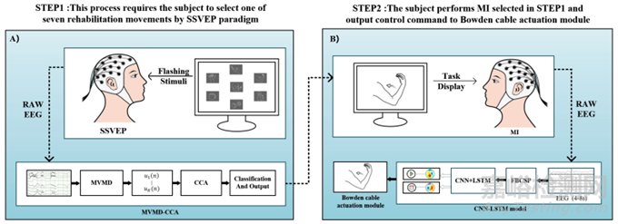 近日,浙江工業(yè)大學(xué)設(shè)計研究院的研究團隊在《IEEE JOURNAL OF TRANSLATIONAL ENGINEERING IN HEALTH AND MEDICINE》上發(fā)表了基于混合腦電控制的4自由度外骨骼的新研究。它采用Bowden線驅(qū)動,結(jié)合基于穩(wěn)態(tài)視覺誘發(fā)電位(SSVEP)和運動想象(MI)的混合腦電控制方法,以促進主動康復(fù)和提供更多控制命令,為上肢康復(fù)注入了新的活力。