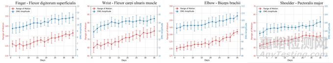 圖5:35天康復(fù)訓(xùn)練中所有受試者的關(guān)節(jié)活動度和平均EMG振幅的記錄(圖片來自原文)