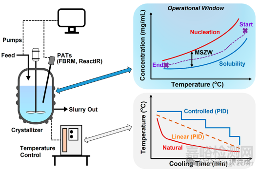 對于涉及反應(yīng)或反溶劑的結(jié)晶,進料流的混合會極大地影響結(jié)晶過程,從而影響關(guān)鍵質(zhì)量屬性,如粒度分布。此外,冷卻和反溶劑結(jié)晶中的濃度控制已有報道。在冷卻結(jié)晶中,將溶液濃度曲線保持在亞穩(wěn)區(qū)內(nèi)并更接近溶解度曲線,有助于晶體生長。階梯式冷卻(開始時速度較慢,接近結(jié)束時速度較快)通過優(yōu)化的溫度軌跡提供恒定的過飽和度。線性冷卻往往會產(chǎn)生更多的顆粒,導(dǎo)致更寬的尺寸分布。