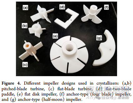 選擇使用特定的葉輪是基于其在懸浮液中實現(xiàn)進料均勻快速混合的能力,并有助于有效的熱傳遞。此外,來自攪拌器的剪切力不應(yīng)導(dǎo)致生長晶體的磨損或?qū)е逻^度的二次成核,這可能導(dǎo)致PSD控制不良。