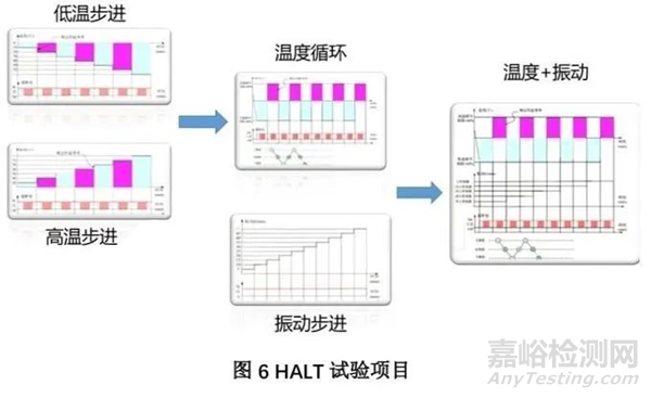 HALT試驗對產(chǎn)品施加的應(yīng)力主要是溫度和振動應(yīng)力,也可考慮施加濕度等常見環(huán)境應(yīng)力。除此之外,還要考慮在HALT期間可以向產(chǎn)品施加的所有可能的應(yīng)力,比如可以考慮通電循環(huán)、電壓變化、頻率變化、電流等可以激發(fā)產(chǎn)品相關(guān)設(shè)計或工藝問題的應(yīng)力。