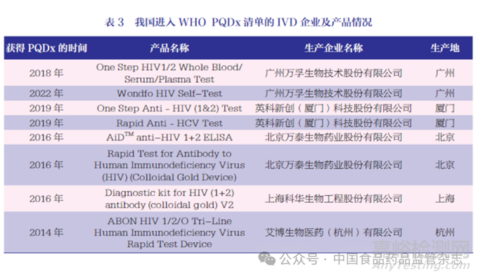當(dāng)前WHO PQDx 清單中有113 款I(lǐng)VD 產(chǎn)品, 其中約70%來自雅培、羅氏、丹納赫3 家跨國企業(yè);有8 款產(chǎn)品由我國本土企業(yè)生產(chǎn),來自廣州萬孚生物技術(shù)股份有限公司、英科新創(chuàng)(廈門)科技股份有限公司、北京萬泰生物藥業(yè)股份有限公司、上??迫A生物工程股份有限公司和艾博生物醫(yī)藥(杭州)有限公司,獲得WHO PQDx 的IVD 產(chǎn)品為HIV和丙型肝炎病毒檢測,見表3。