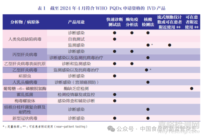 截至2024 年4 月,WHOPQDx 納入了傳染病、腫瘤和遺傳性疾病相關(guān)檢測,涵蓋艾滋病、瘧疾、乙肝、丙肝、結(jié)核病、梅毒、霍亂、新冠肺炎、宮頸癌、 葡萄糖-6- 磷酸脫氫酶(G-6-PD)缺乏癥等 [4],見表1。