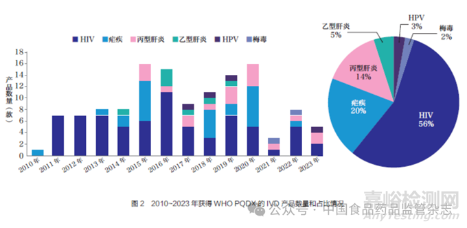 PQDx 的啟動正值全球HIV傳播趨勢有效控制、抗逆轉(zhuǎn)錄病毒普及率大幅提高之際。全球艾滋病防控面臨著在資源有限地區(qū)迫切需要更經(jīng)濟(jì)、簡便的診斷方法的新挑戰(zhàn)。為強(qiáng)調(diào)應(yīng)對該挑戰(zhàn)的重要性,2012 年WHO 和國際藥品采購機(jī)制(UNITAID)宣布未來10 年為“診斷十年”。在這種背景下,WHO PQ 發(fā)揮了重要作用,其建立的PQDx 審評機(jī)制采用了類似于嚴(yán)格監(jiān)管機(jī)構(gòu)的程序,確保包括HIV 診斷產(chǎn)品在內(nèi)的重點(diǎn)IVD 產(chǎn)品符合國際統(tǒng)一的質(zhì)量、安全和有效性標(biāo)準(zhǔn),從而使得國際資助機(jī)構(gòu)能夠采購和分發(fā)有質(zhì)量保障的HIV 診斷產(chǎn)品。據(jù)統(tǒng)計(jì)數(shù)據(jù)顯示,2012 年主要利益相關(guān)方采購的5870 萬份檢測產(chǎn)品中,帶有“WHO PQ”標(biāo)簽的HIV 快檢測產(chǎn)品占85%。2011~2023 年,累計(jì)通過WHOPQ 的HIV 相關(guān)檢測產(chǎn)品數(shù)量達(dá)71 款,占所有PQDx 產(chǎn)品的55%。