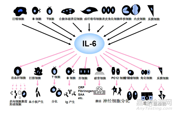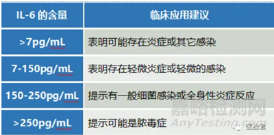 不同炎癥性疾病,IL-6的含量具有顯著性差異;細菌感染導(dǎo)致IL-6升高的水平顯著高于非細菌感染;細菌感染后,IL-6水平可在2h達高峰,其升高水平與感染的嚴(yán)重程度相一致;感染未控制時,IL-6持續(xù)升高;一旦感染控制,IL-6大幅下降,通過測定血中IL-6水平對評估病情嚴(yán)重程度、抗生素治療效果及判斷預(yù)后有重要意義。