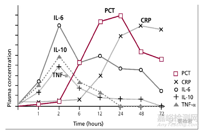 IL-6在急性炎癥反應(yīng)中處于中心地位,研究顯示細菌感染后IL-6率先生成,隨后誘導(dǎo)C反應(yīng)蛋白(CRP)和降鈣素原(PCT)生成,PCT在感染2h后增加,而CRP在6h后才迅速增加,因此IL-6可用來輔助急性感染的早期診斷。