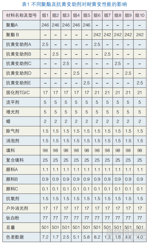 3.1 聚酯及抗黃變助劑對涂層抗黃變性能的影響測試