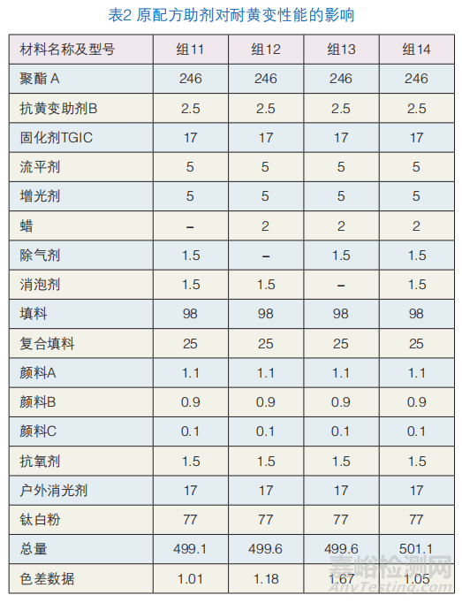 3.2 原配方助劑對涂層抗黃變性能的影響測試