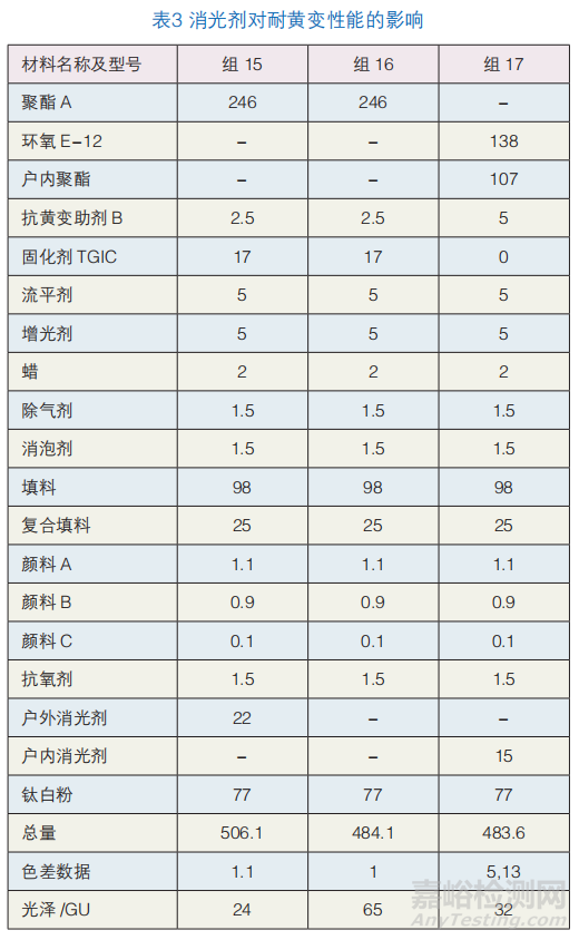 3.3 不同體系的消光配方對涂層抗黃變性能的影響測試