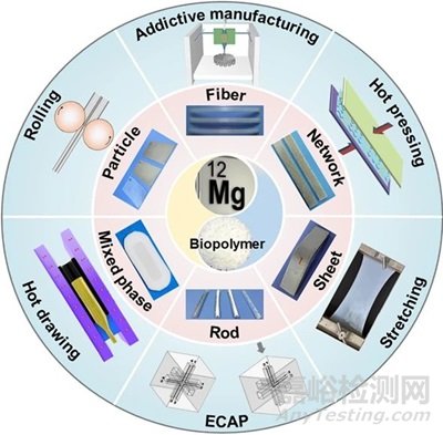 從復(fù)合材料組成之一的基體相角度考慮,盡管提高聚合物的相對分子質(zhì)量可以使得復(fù)合材料的力學(xué)性能得到顯著提高,但聚合物的分子量與其綜合成本成正相關(guān)關(guān)系;因此,依賴分子量的提高獲得高強(qiáng)度的復(fù)合材料顯然是不經(jīng)濟(jì)的。為了克服這一難題,在金屬-聚合物材料復(fù)合的基礎(chǔ)上,利用物理方法進(jìn)一步對其進(jìn)行加工以獲得高強(qiáng)韌的復(fù)合材料無疑是一種更為便捷和經(jīng)濟(jì)的方法。秉承這一理念,研究團(tuán)隊借鑒了金屬劇烈塑性變形的加工理念,針對復(fù)合材料二次開發(fā)出了極具特色的注塑成型法、等通道轉(zhuǎn)角擠壓法、熱壓法、熱拉拔法、拉伸法、軋制法和增材制造法等,實現(xiàn)了可降解Mg/聚合物復(fù)合材料的強(qiáng)韌化制備(圖2)。