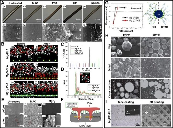 圖3:可降解Mg/聚合物復(fù)合材料界面修飾策略:(A) 拉伸實驗后不同表面改性Mg纖維的表面光學(xué)顯微鏡形貌和SEM形貌;(B) 分子動力學(xué)模擬前后的鍵長、鍵角以及PLA層到修飾表面的距離變化;(C) 動態(tài)模擬5萬步后PLA結(jié)構(gòu)和Mg、MgO、MgF2表面的半徑旋轉(zhuǎn)(Rg)變化;(D) PLA分子鏈徑向分布函數(shù)與Mg、MgO和MgF2表面徑向距離的關(guān)系;(E) 剪切試驗后不同表面改性(未經(jīng)處理、MAO、MgF2)處理后及Mg與PLA復(fù)合前后的表面形貌SEM圖像;(F) MAO處理后Mg纖維與PLA基體界面結(jié)合機(jī)理;(G) PEI和CTAB修飾后Mg顆粒懸浮液Zeta電位的變化以及PEI和CTAB在Mg顆粒表面的吸附示意圖;(H) pH為9和pH為11時懸浮液中Mg顆粒的表面和截面圖像;(I) MgPEI/PLA薄膜(左)和Mg添加量為10 wt.%的支架(右)的表面和截面形貌