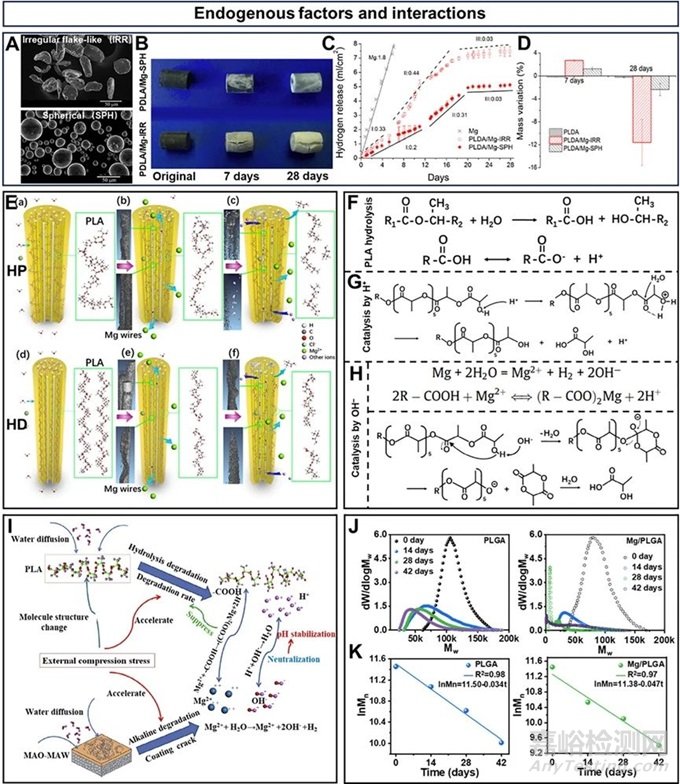 圖4:影響復(fù)合材料降解速率的內(nèi)源因素及降解過程中復(fù)合組元的相互作用:(A) 不規(guī)則片狀和球形Mg顆粒的SEM圖像;(B) PLDA/Mg?IRR和PLDA/Mg?SPH柱狀物在PBS溶液中浸泡7天和28天后的照片;(C) 氫氣累計釋放量與浸泡時間的關(guān)系;(D) 浸泡7天和28天后干燥樣品質(zhì)量變化百分比;(E) X ray?CT法檢測熱壓和熱拉拔態(tài)Mg/PLA復(fù)合棒在不同降解時間點(diǎn)的降解差異示意圖;不同環(huán)境下PLA的降解機(jī)理及Mg與PLA的相互作用:(F)在中性介質(zhì)中的水解機(jī)制;(G) 在H+催化PLA水解機(jī)制;(H) 在OH?催化PLA水解機(jī)制;(I) Mg/PLA中雙組元協(xié)同降解效果示意圖;(J) PLGA微纖維和Mg/PLGA微纖維中的PLGA凝膠滲透色譜曲線;(K) lnMn隨降解時間的擬合曲線