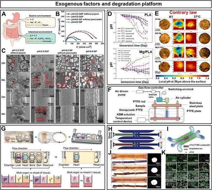 圖5:影響復(fù)合材料降解速率的外源因素及基于微流控和器官芯片技術(shù)的新型降解平臺示意圖:(A) 胃腸環(huán)境圖;(B) 鎂絲浸沒在不同介質(zhì)中的Nyquist圖;(C) 鎂絲樣品在不同降解介質(zhì)中浸泡24h后的SEM圖像;(D) 純PLA和Mg/PLA試樣的降解行為與壓應(yīng)力、溫度和時間的關(guān)系;(E) 25℃或37℃下不同Mg樣品在HBSS浸泡1h后局部pH值的分布圖;(F) 耦合多因素的Mg/聚合物降解試驗綜合裝置示意圖;(G) 模塊化、多組織平臺組件、組裝和集成多器官芯片用于新型降解平臺的示意圖;(H) 進(jìn)口流量為10µL/min時,Mg絲上的流動剪切應(yīng)力和微流控通道內(nèi)的流速分布云圖;(I) 用于動態(tài)降解觀察的微流控芯片模型;(J) 微流體中不同樣品的表面和截面光學(xué)顯微鏡圖像;(K) 培養(yǎng)12h后植入不同樣品的芯片中凋亡的內(nèi)皮細(xì)胞(紅色)圖像