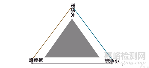 事實上,“技術難度低”、“市場潛力大”、“競爭壓力小”是一個三角關系(如上圖所示),是不可能同時存在的,企業(yè)只能盡量地折中平衡,在陰影區(qū)域中選擇最有利的位置。因為這種三角關系,分析者并不能客觀地評價品種好壞。為了便于實操,筆者建議使用了三個新標準進行代替。