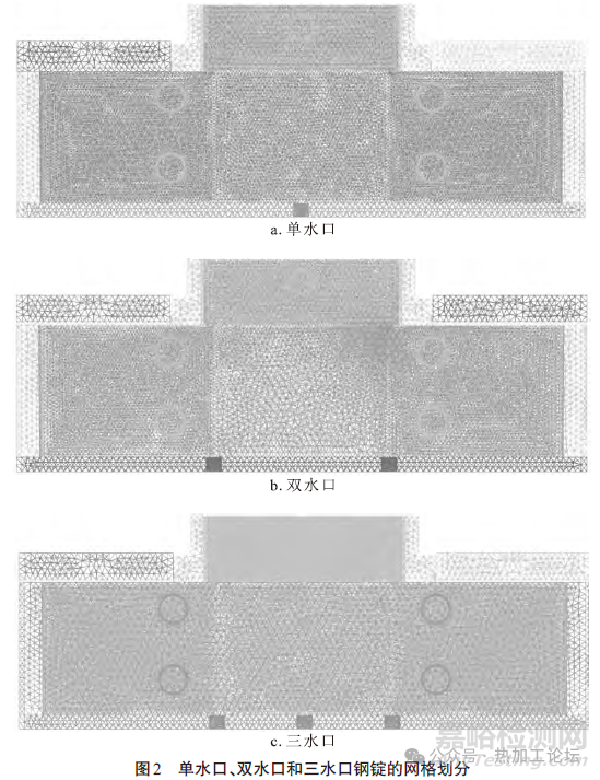 使用UG12.0 軟件進(jìn)行三維建模,分別建立單、雙和三水口超大寬厚比鋼錠模型,并將建立的模型導(dǎo)入ProCAST軟件中的MESH模塊,采用四面體單元依次進(jìn)行面網(wǎng)格和體網(wǎng)格劃分,綜合考慮計(jì)算精度和效率,單元尺寸設(shè)定為20mm。水口處結(jié)構(gòu)較復(fù)雜且鋼液流速較快,故進(jìn)行局部網(wǎng)格細(xì)化。最終單水口、雙水口和三水口有限元模型劃分的體網(wǎng)格總數(shù)分別為63萬、70萬和88萬,如圖2所示。
