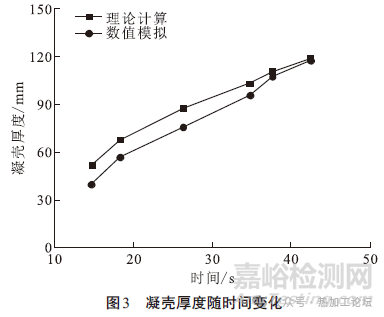 根據(jù)鋼錠凝固的平方根定律,鋼錠凝固層厚度(S/mm)與凝固時(shí)間(t /min)的平方根成正比,即S =K(t2/1) ,其中K為凝固系數(shù),本文取K=20。數(shù)值模擬及理論計(jì)算的凝殼厚度隨時(shí)間變化曲線如圖3所示。數(shù)值模擬的凝殼厚度與理論計(jì)算結(jié)果趨勢一致,兩者相差在15%以下,驗(yàn)證了數(shù)值模擬的準(zhǔn)確性。