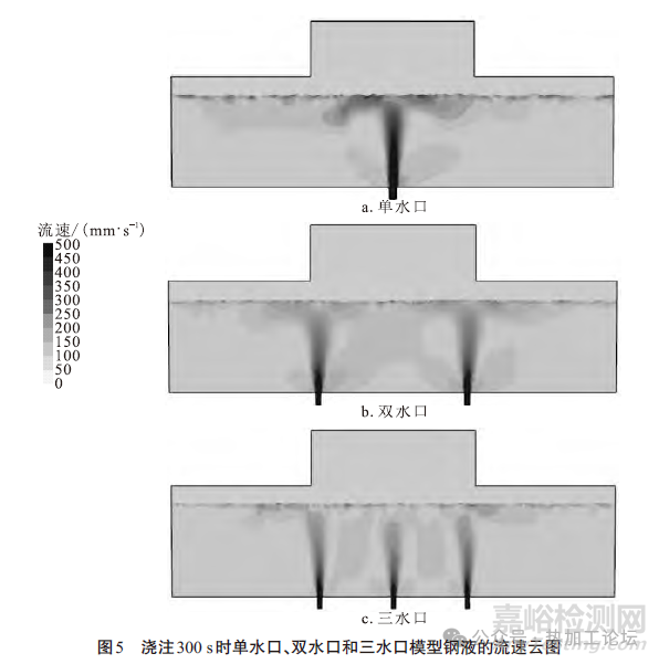 三種水口模型澆注5min時(shí)的流動情況如圖4所示。單水口上方存在單個注流,該注流從水口延伸至液面后改變方向分成左右兩個流股,其中部分鋼液向下回流,形成水平長度約2820mm的對流循環(huán),另一部分鋼液水平流至錠模窄面處。雙水口模型中存在兩個注流,4個穩(wěn)定的對流循環(huán)區(qū)分布在注流周圍,其中兩注流之間的循環(huán)范圍較小,注流外側(cè)的對流范圍較大,對流循環(huán)總長約5020mm。三水口充型時(shí),存在三個較細(xì)的注流和6個對流循環(huán)區(qū),位于注流間的對流循環(huán)范圍極小,此時(shí)對流循環(huán)的總長約4080mm。多水口模型的對流循環(huán)范圍明顯大于單水口模型,擴(kuò)大了鋼液循環(huán)流動范圍,加快鋼液面更新速度,利于鋼中氣體排出,減少氣孔、裂紋以及柱狀晶的生成,起到攪拌鋼液、細(xì)化晶粒的作用。