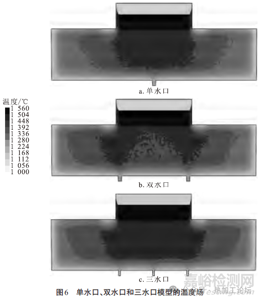 (2)雙水口鑄錠40min時(shí),兩水口間出現(xiàn)底約1750mm、高約625mm的三角形低溫區(qū)域,該低溫區(qū)阻礙鋼錠補(bǔ)縮通道,影響冒口的補(bǔ)縮效果。單水口和三水口模型凝固時(shí)未產(chǎn)生三角形低溫區(qū),二者補(bǔ)縮效果優(yōu)于雙水口澆鑄。