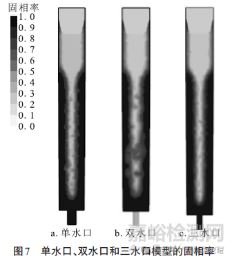 三種模型窄面的固相率如圖7所示。從補(bǔ)縮效果角度分析,雙水口模型中部的低溫區(qū)域阻礙冒口對下部鋼液的補(bǔ)縮,易產(chǎn)生疏松縮孔等缺陷,而單水口和三水口模型補(bǔ)縮通道通暢,凝固方向?yàn)樽韵露?、從四周向中間進(jìn)行,補(bǔ)縮效果良好,不易形成疏松或縮孔缺陷。