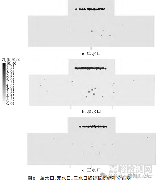 圖8為鋼錠內(nèi)部疏松縮孔的模擬結(jié)果。在單水口模型中,大型縮孔只出現(xiàn)在冒口部位,冒口下方的鋼錠本體存在小型疏松和縮孔,鋼錠本體內(nèi)孔隙率大于3.7%的疏松縮孔體積為211cm3。這是由于隨著凝固的進(jìn)行,冒口中貯存的液態(tài)鋼液不斷向下補(bǔ)縮,本體中鋼液凝固收縮形成的空隙受到來自冒口處的鋼液補(bǔ)充,形成較小的疏松,這些小的疏松能通過后續(xù)軋制工藝壓合,對產(chǎn)品不產(chǎn)生影響。雙水口鋼錠的冒口下方出現(xiàn)集中的小型縮孔,是由于雙水口間的低溫區(qū)內(nèi)提前凝固成固相,阻礙上方鋼液向下補(bǔ)縮,形成集中的縮孔缺陷??s孔聚集在鋼錠中部,距鋼錠底部550mm至840mm處,雙水口鋼錠本體內(nèi)疏松縮孔總體積為287cm3。三水口鋼錠內(nèi)部疏松縮孔分布均勻,未出現(xiàn)大型的疏松或縮孔,本體內(nèi)疏松和縮孔的總體積為181cm3,比單水口鋼錠減少14.2%,比雙水口鋼錠減少36.9%。這是由于三水口模型充型時(shí)流場穩(wěn)定,凝固過程中補(bǔ)縮通道通暢,只形成能被壓合的小型疏松縮孔。三種模型的冒口內(nèi)部均存在由于鋼液向下補(bǔ)縮而形成的大型縮孔,后續(xù)切除冒口后,該處的大型縮孔對鋼錠本體質(zhì)量沒有影響。模擬結(jié)果表明,三水口澆鑄的鋼錠質(zhì)量優(yōu)于單、雙水口澆鑄的鋼錠。