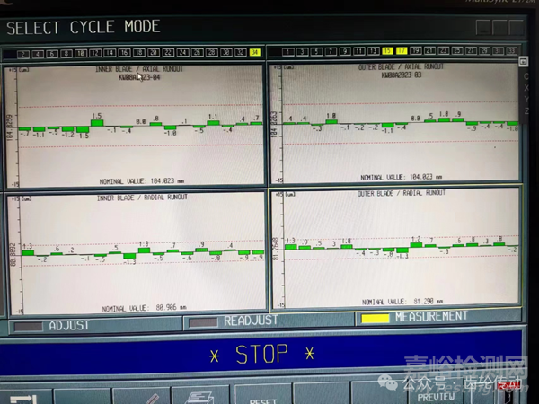 銑刀、涂層刀頭、拉刀、刀盤刀具的刃磨精度和裝刀精度會直接影響到加工齒輪的精度,刀具在加工過程中要盡量減少刀高跳動和徑向跳動。使用刀具要具備高硬度、高耐磨性,和高強度韌性,耐熱性和工藝性能經(jīng)濟性。在實際生產(chǎn)中徑向跳動≤0.025mm,刀高跳動≤0.025mm,對于弧齒錐齒輪來說無論是內(nèi)刀或是外刀,刀高和徑向跳動均如此要求,具體檢測部位及檢測方法及檢測結(jié)果如下圖所示。